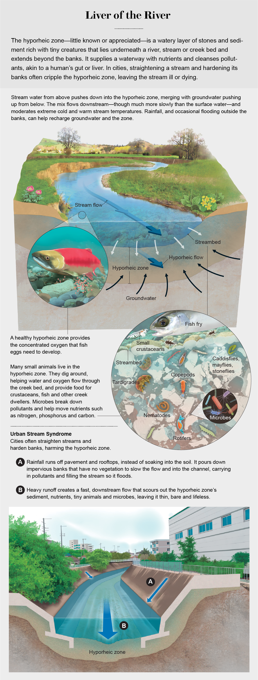 A stream is a system. It includes not just the water coursing between the banks but the earth, life and water around and under it. Lynch had been tracking discoveries about a layer of wet sediment, small stones and tiny creatures just below the streambed called the hyporheic zone—a term from the Greek hypo, meaning “under,” and rheos, meaning “flow.” Stream water filters down into this dynamic layer, mixing with the groundwater pushing up. Water in the hyporheic zone flows downstream like the surface water above it but orders of magnitude more slowly.